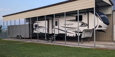 RV storage facility is a specialized steel structure designed to securely house recreational vehicles. With ample space and high ceilings, it accommodates various RV sizes while providing protection from weather elements. Features may include individual storage bays, ventilation, and easy access for owners.